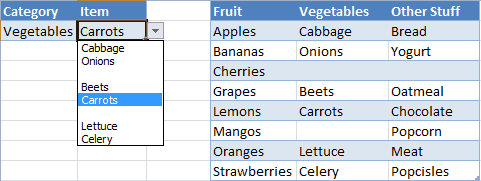 I have following question. Lets say you selected a value in column A, as Fruit, and then in column B you select Banana. Now if you go back to the same row, and you change the selection in column A to Vegetable, in column B you still have Banana. Is there a way around to block the list in column A when there is a value in Column B?