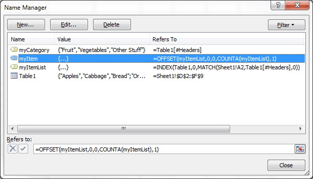 Any references to Table1 can be replaced by its range reference, which is D2:F( in this blog article example. The defined name for myItemList would become =INDEX($D$9:$F$9,0,MATCH(Sheet1!A2,$D$1:$F$1,0)) but the problem with this is that the table is not dynamic. If you add data to the table (that's not a table) you have to change the range reference.