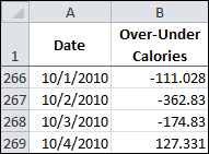 The example data is a spreadsheet I use to log my over-under calories to goal each day. This data is downloaded periodically and currently the data goes down to row 269, as you can see below.
