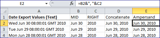 Notice that ", " is the second argument, which is a comma followed by the space character, all in quotes. The result is: Jun 30, 2010. You get a better sense of the arguments by looking at the Function Arguments dialog box.