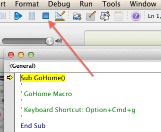 - Click the square Reset button to stop the macro program execution. (Note: If you know how to navigate the VBA editor, you can skip this last step and choose Tools > Macro > Visual Basic Editor and then locate the macro.
